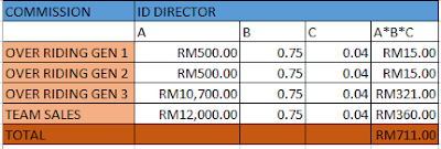 Topik yang paling menarik untuk diceritakan setelah bergelar director ialah komisen. Jadi artikel ini saya khaskan untuk menceritakan kelebihan mejadi director dari sudut komisen. Jika sebagai consultant, dengan pembelian sebanyak RM12,000 kita hanya mampu mendapat RM351 sebagai komisen. Tetapi sebagai director kita mampu untuk mendapat RM711. Hampir dua kali ganda dari komisen consultant.